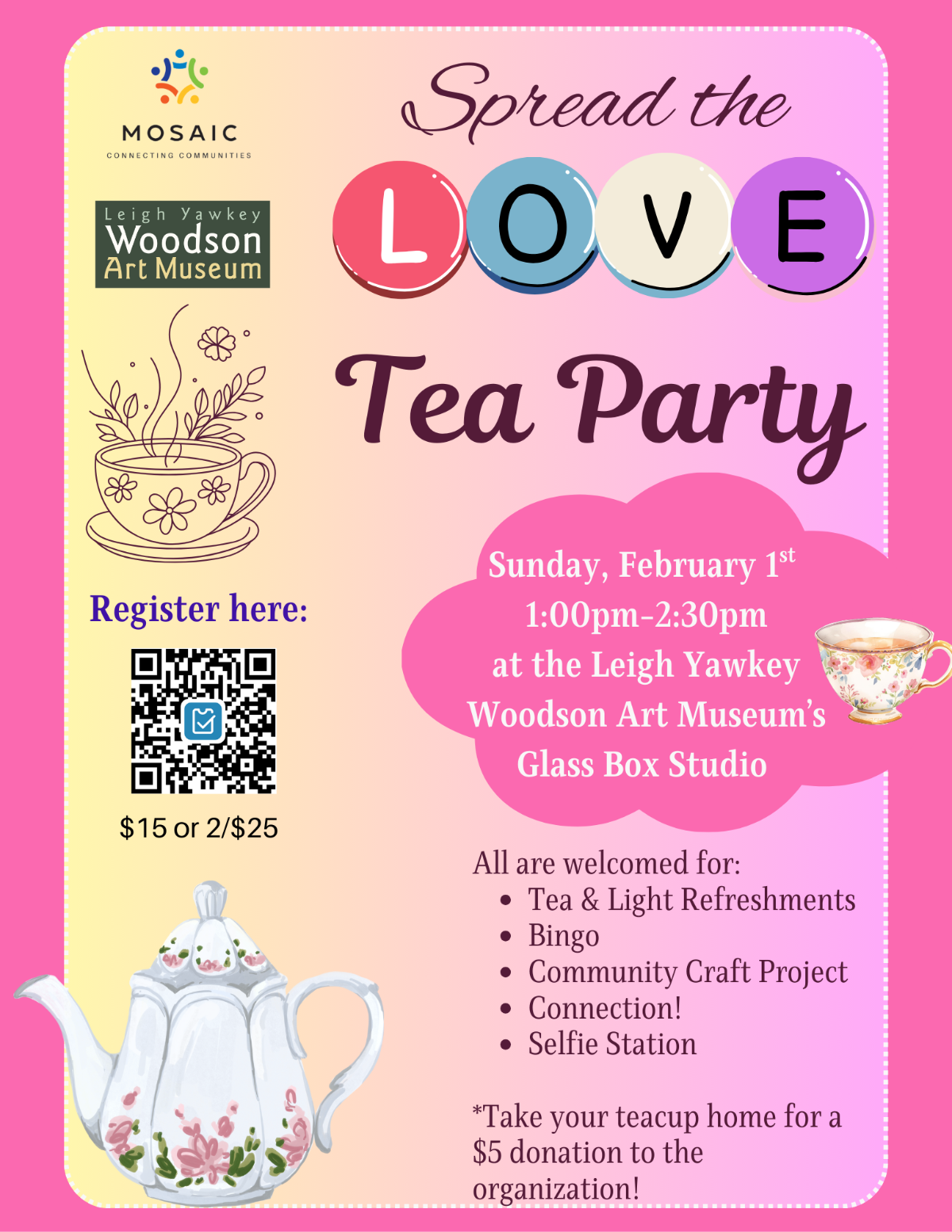 Join us on Sunday, February 1st from 1:00pm-2:30pm for Mosaic's “Spread the Love Tea Party” at the Leigh Yawkey Woodson Art Museum's “Glass Box Studio”.