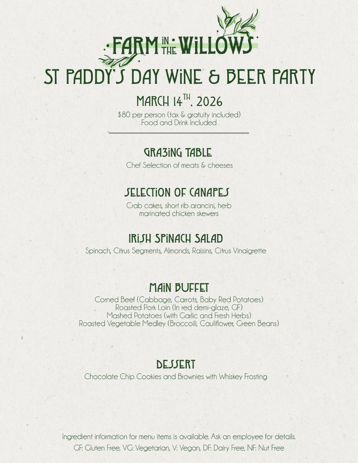 Come join us at Treleaven Wines for our St Patrick's Day Wine Party on March 14, 2026 at 6:00 PM (Eastern Time). Get into the festive spirit with a glass of your favorite wine or beer and celebrate St. Patrick's Day with us!