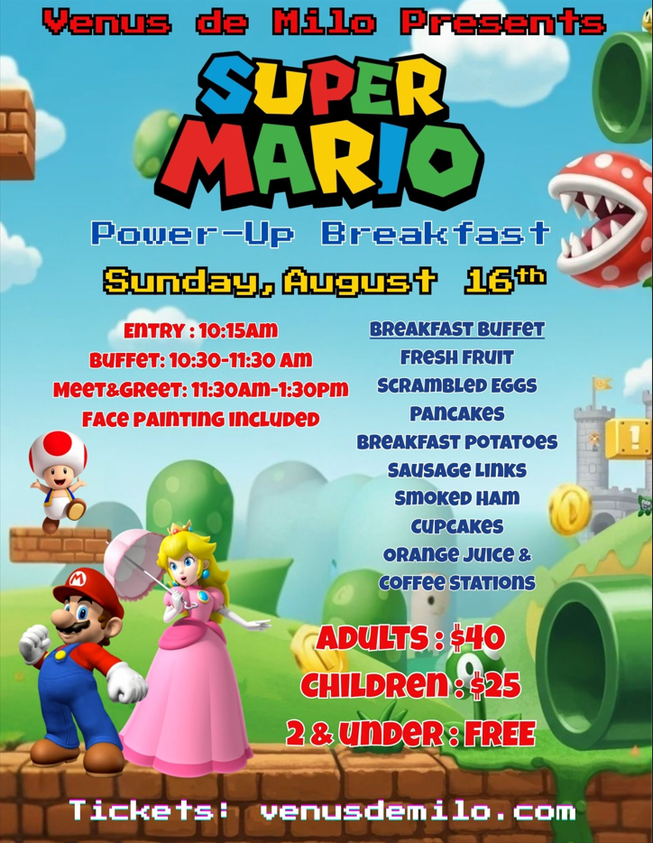 Join us for a Super Mario-themed Breakfast Buffet where the fun starts the moment you walk in. Enjoy a delicious spread of breakfast favorites while stepping straight into the Mushroom Kingdom.