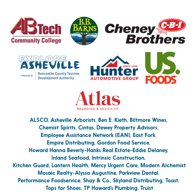 Participating restaurants include (list subject to change): Asheville Area Food Guild, Asheville Forager, Baked Pie Company, Biltmore Winery, The Bier Garden, Biscuit Head, Botanist and Barrel Tasting Bar and Bottle Shop, Burial Beer Co/ VISUALS Wine, Chai Pani Restaurant Group, Chemist Spirits, Chestnut, Copper Crown, Corner Kitchen, Crusco, Cúrate Tapas Bar, Daphne's Catering, Dynamite Roasting Co., Empire Distributors of NC, Farm Burger Asheville, French Broad Chocolates, The Funkatorium by Wicked Weed, Gan Shan AVL, Gemelli, Grey Eagle Taqueria, Gypsy Queen Cuisine, Hickory Nut Gap, Highland Brewing, The Hop Ice Cream, Huli Sue's BBQ and Grill, Jargon, Jerusalem Garden, Jettie Rae's Oyster House, The Lobster Trap, Luella’s Bar-B-Que, Modern Alchemist, Mountain Valley Spring Water, Old Europe, Pack's Tavern, Posana, Quench! Wine Bistro, Red Fiddle Vittles, Red Ginger, The Red Stag Grill, regina's westside, RendezVous French Comfort Food, Roll Up Herbal Bar, St. Rains, Sage and Spice, Salt Face Mule Brewing Company, Skyland Distributing, Strada Italiano, South Paw AVL, Sunny Point Cafe, Tall John's, Tupelo Honey, Twisted Laurel Downtown, Twisted Laurel Weaverville, Vinnie's Neighborhood Italian, Well Played Board Game Café, The West End Bakery, White Labs Brewing Co.