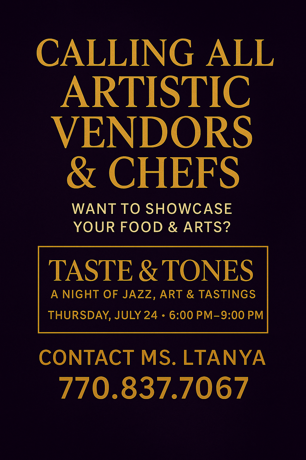 🚨 CALLING ALL VENDORS & CHEFS! Want to showcase your food or creations at this unique event? We're inviting chefs and vendors to be part of the experience! 📞 Contact Ms. LTanya at 770.837.7067 to reserve your spot!