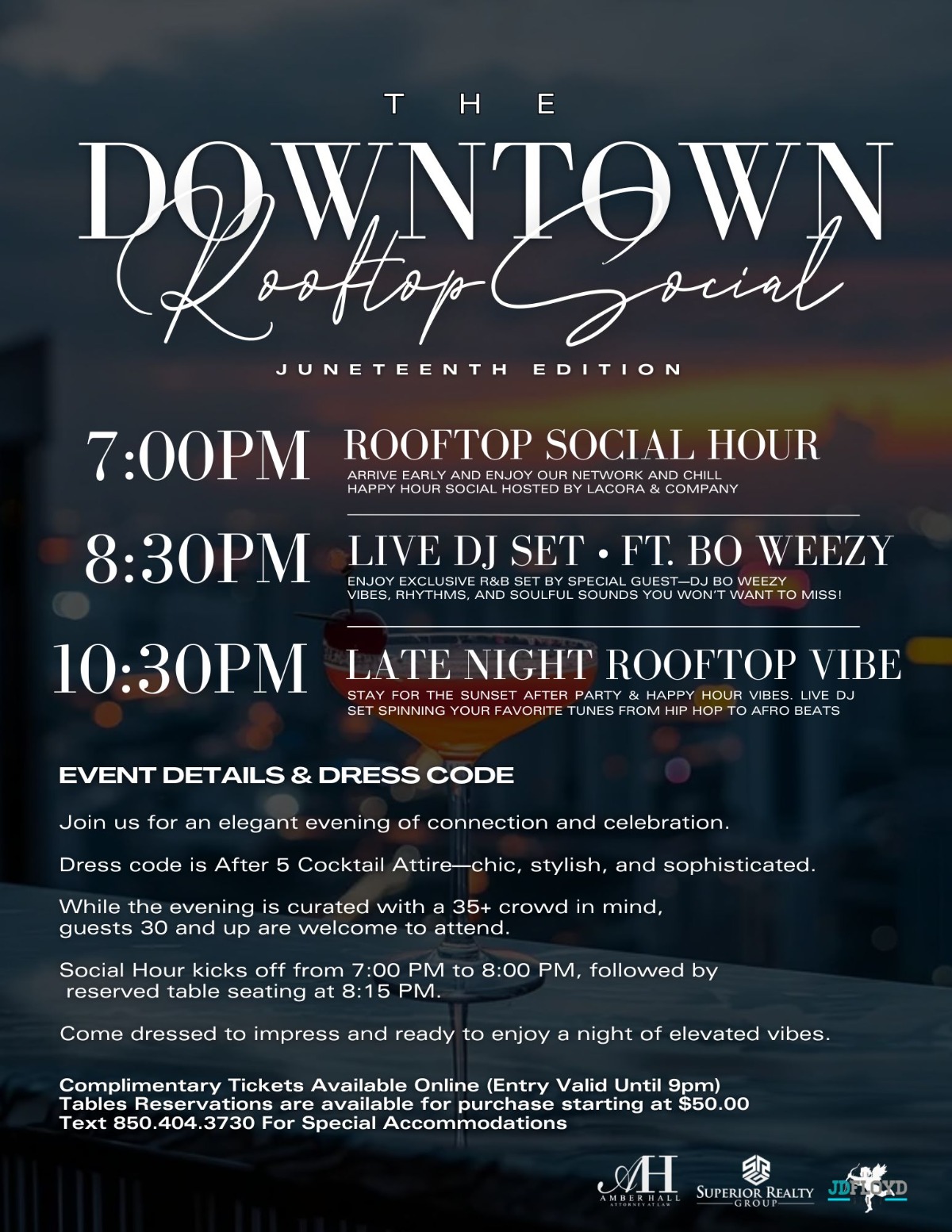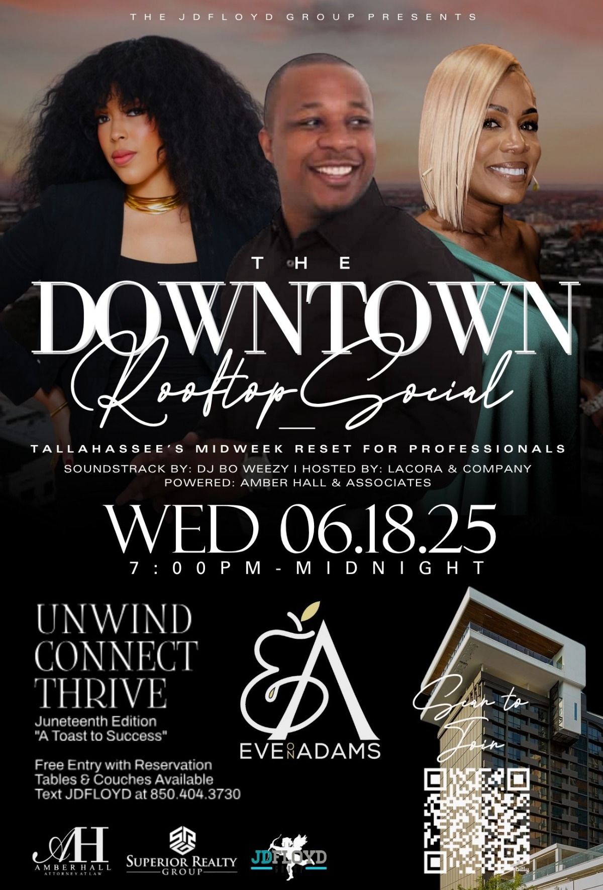 Unwind, connect, and thrive at The Downtown Rooftop Social Series—Tallahassee’s premier after-work gathering for young professionals, entrepreneurs, and creatives. Hosted atop the 17th floor of Eve on Adams, this elevated experience offers