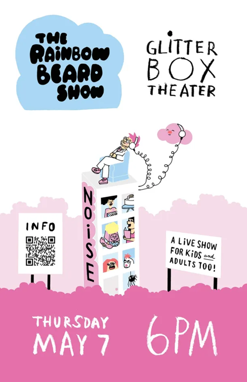 The Rainbow Beard Show is for kids* of all ages and always covers a simple theme using puppets, games, stories, songs, videos, and visits from special guests! This show will be all about NOISE! Where does it come from and why do we make it?