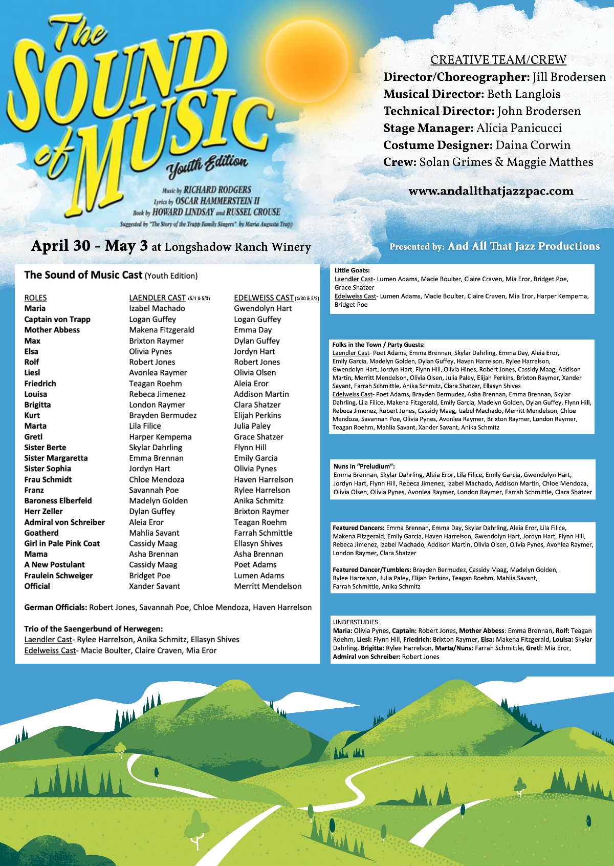 The Sound of Music (Youth Edition) is presented by And All That Jazz! Performing Arts Center, outdoors at Longshadow Ranch Winery on April 30, May 1, 2 & 3. The "Edelweiss Cast" will perform on April 30 & May 2. The "Laendler Cast" will perform on May 1 & 3. See Cast List below, indicating role assignments for each cast.