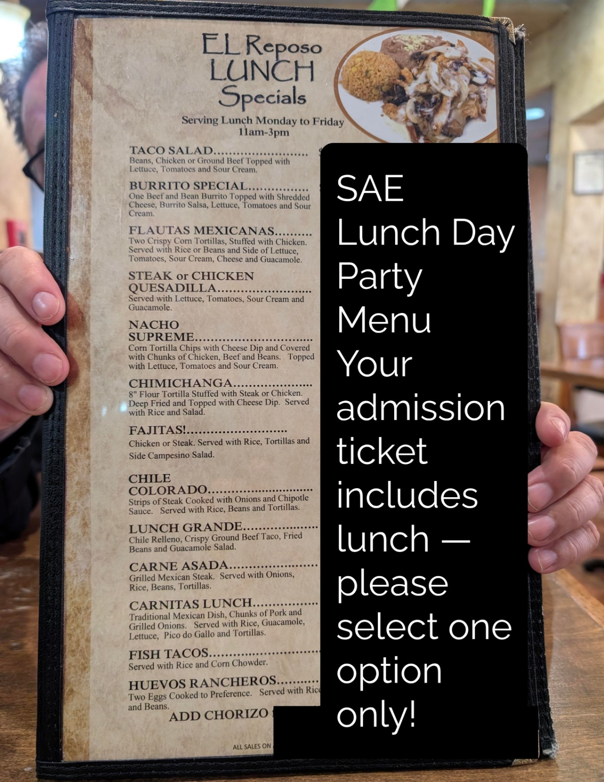 🍽️ Food Options: • El Reposo Mexican LUNCH Menu ITEMS with $40 ticket