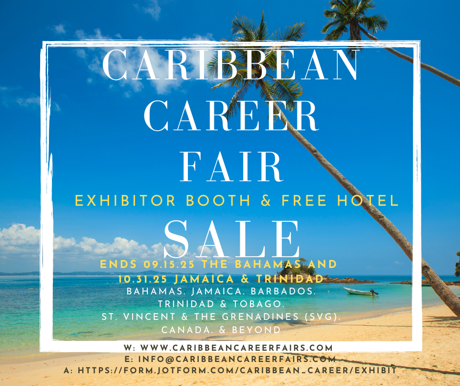 Guarantee your business presence and instantly register as an Exhibitor at any of our upcoming Caribbean Career Fairs (CCF) when you pay the $1000 USD or $1000 CAD depending on ticketing site security deposit per Caribbean Career Fair of your choice. From beach backdrop convention halls to workshops, evening networking sessions while watching the sunset to seminars on the veranda and CEO - Recruitment speakers committed to showcasing their brand. Connect directly with international businesses & higher-education schools in attendance at our free in-person Caribbean Career Fair prospective candidates. Eligible Career Fairs - Exhibitor Registration is Now Open for: The Bahamas Fall Edition November 9-11, 2025 Jamaica Winter Holiday Edition December 17-20, 2025 Trinidad & Tobago Carnival Edition February 7 - 11, 2026 A CCF Exhibitor Coordinator will be in contact within (1) business day of your payment to finalize your Exhibitor Booth and special request. The security deposit will be used to hold your booth, payment is required 60 Days prior to the first-date of move-in at your selected Fair. Security Deposit will be refunded in full, minus any incidentals or additional onsite expense (2) weeks after the end of Career Fair or Refunded within 7 business days if the selected Career Fair is no longer available or upon the initial meeting the Exhibitor chooses to withdraw participation. For more information, speakers, to host a workshop or to book directly contact: info@caribbeancareerfairs.com or americalifestylshow@gmail.com