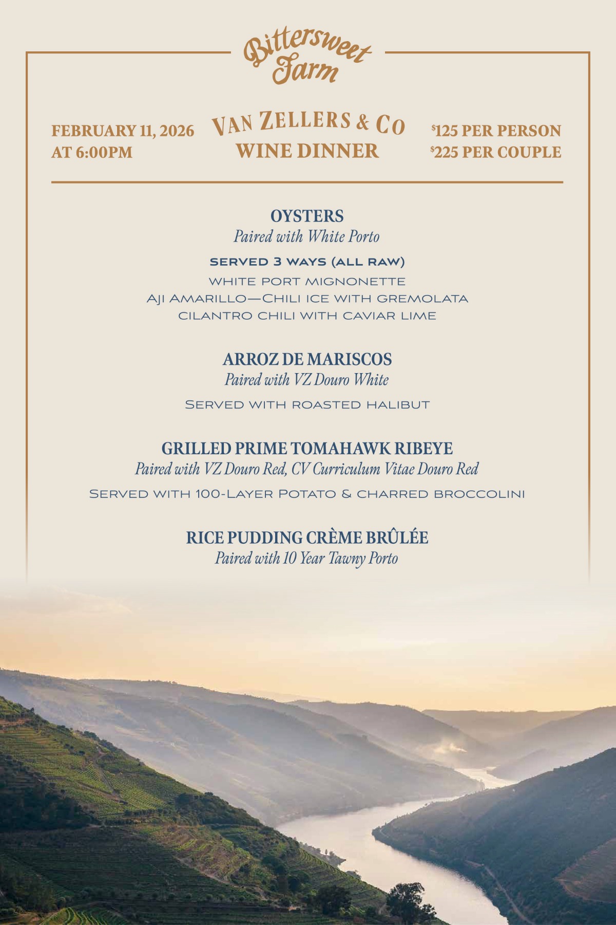 Join us for an intimate, ticketed wine dinner at Bittersweet Farm on February 11 at 6:00 PM, featuring a four-course menu expertly paired with wines from Van Zellers & Co., in collaboration with MS Walker.