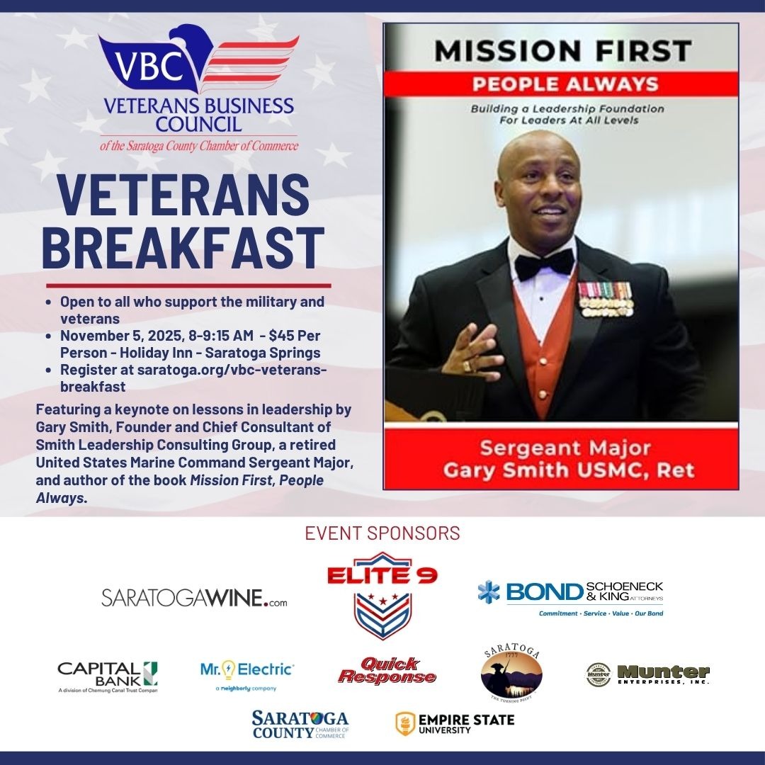 The Veterans Business Council of the Saratoga County Chamber of Commerce invites all who support Veterans to its annual breakfast honoring Veterans. This morning of connection and camaraderie will feature a short formal program to recognize scholarship recipients and a keynote, along with a fantastic opportunity for networking. The VBC Annual Breakfast is a fundraiser for the Veterans Business Council, which works to provide scholarship opportunities and career connections for Veterans.