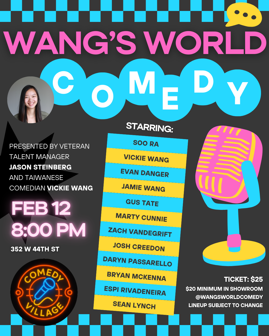 352 West 44th StreetSee Wang's World Comedy at Comedy Village in Times Square, co-produced by veteran talent manager Jason Steinberg of Steinberg Talent Management and Taiwanese comedian Vickie Wang.